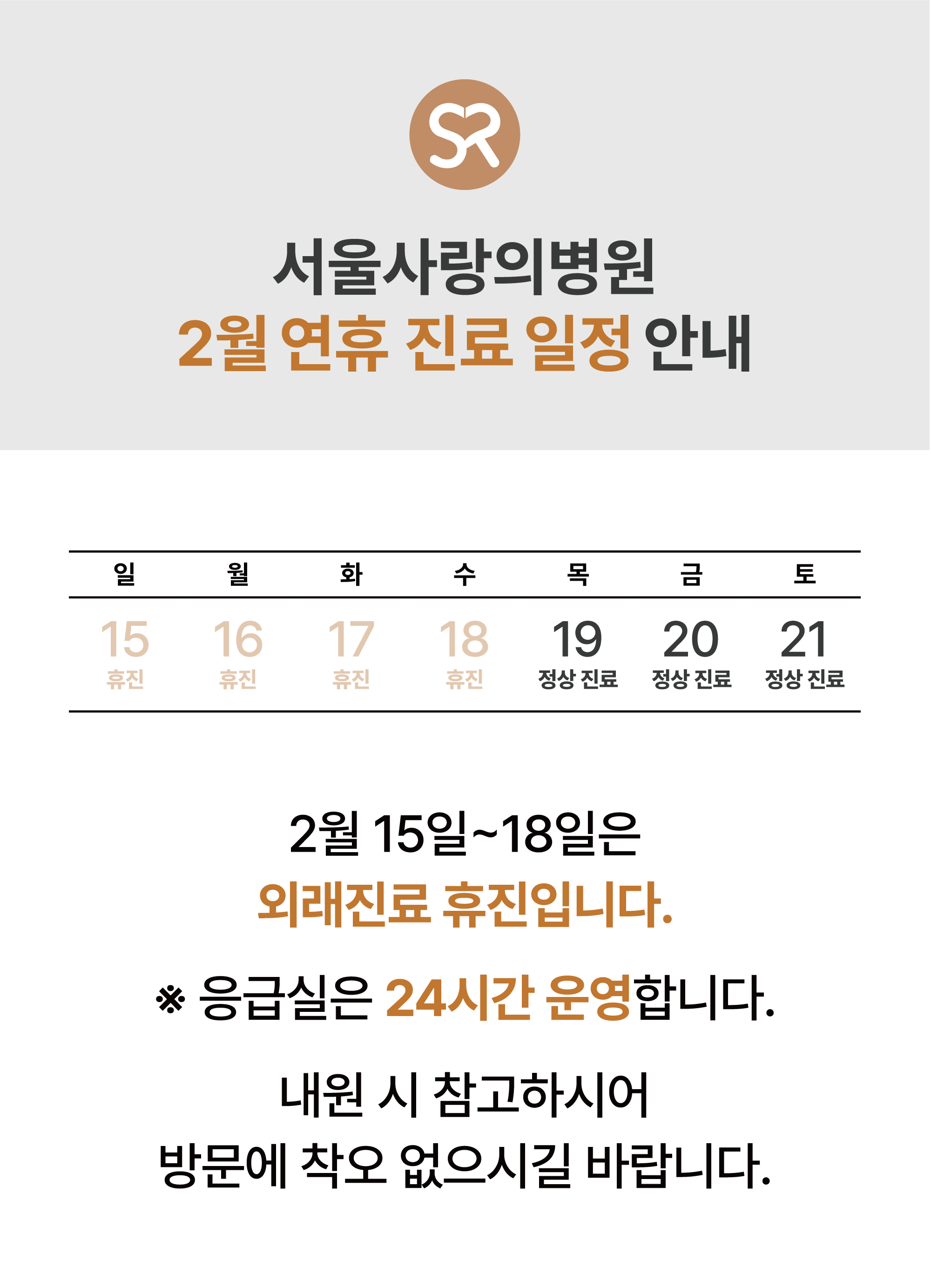 2월 15일~18일 외래진료 휴진, 응급실은 24시간 운영합니다.